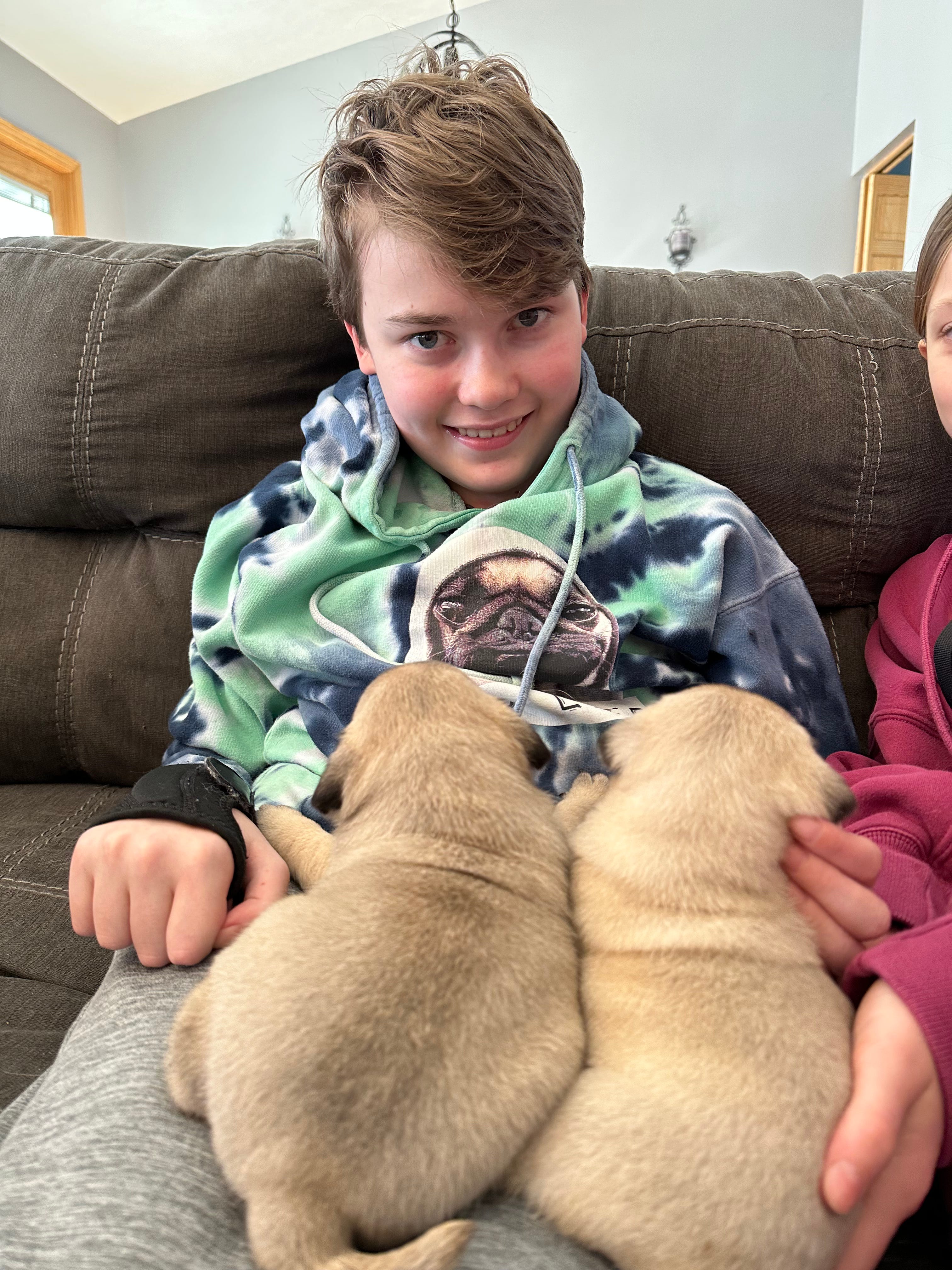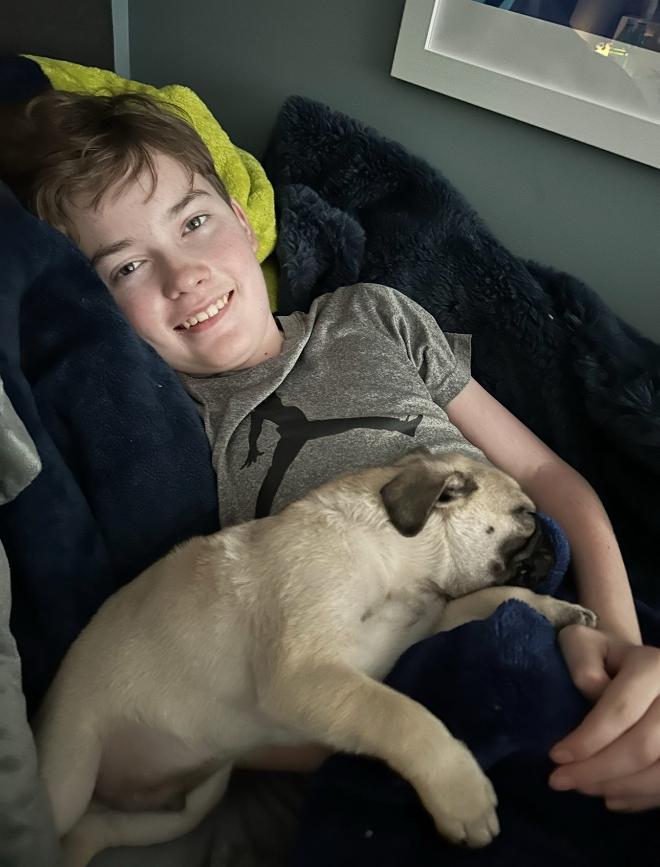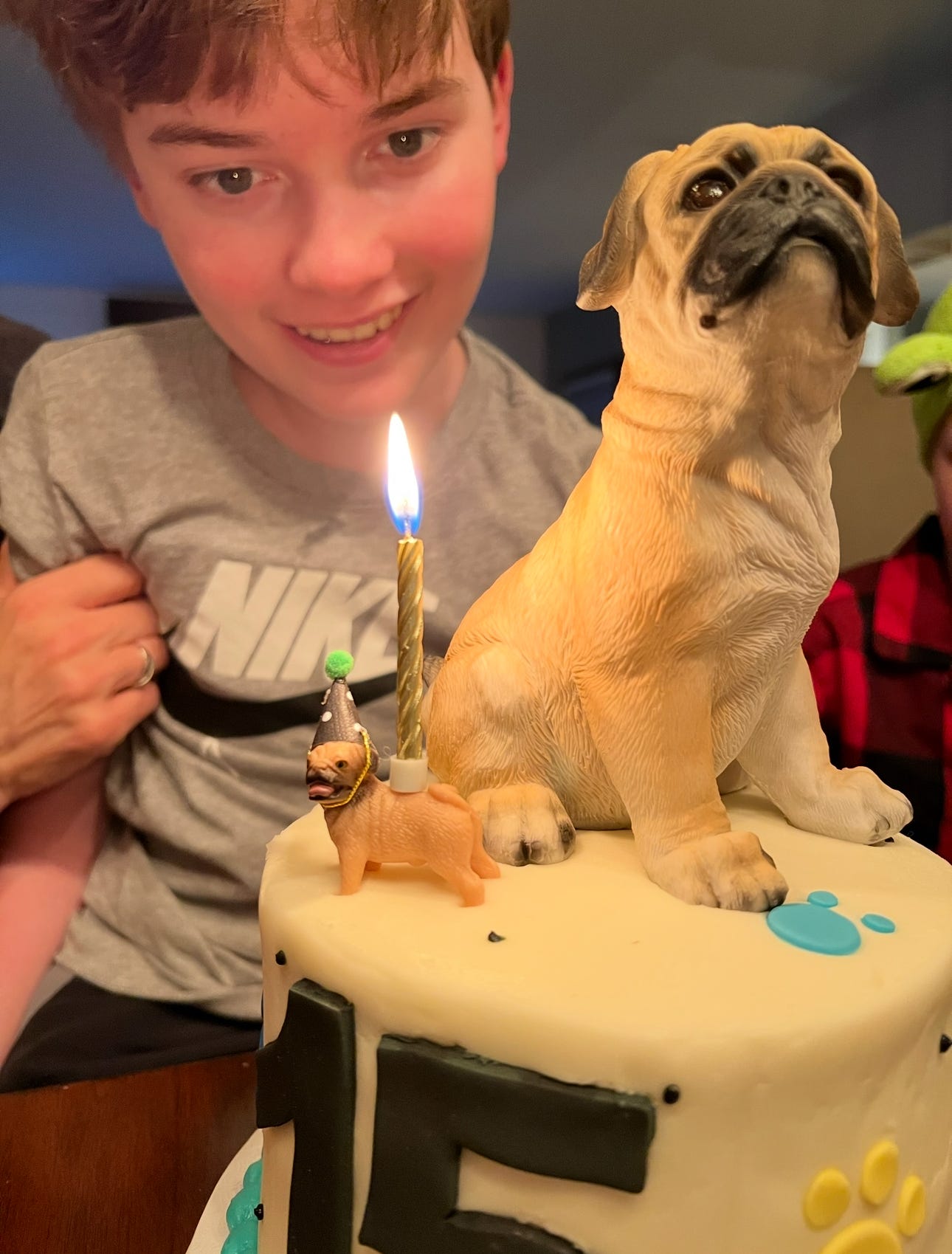 We had a family vacation in Florida that April, and Brady spent most of it daydreaming about the pug waiting for him when we got home. We picked him up on April 11, Brady’s original due date, exactly one week before his fifteenth birthday. It all felt like a cosmic wink.